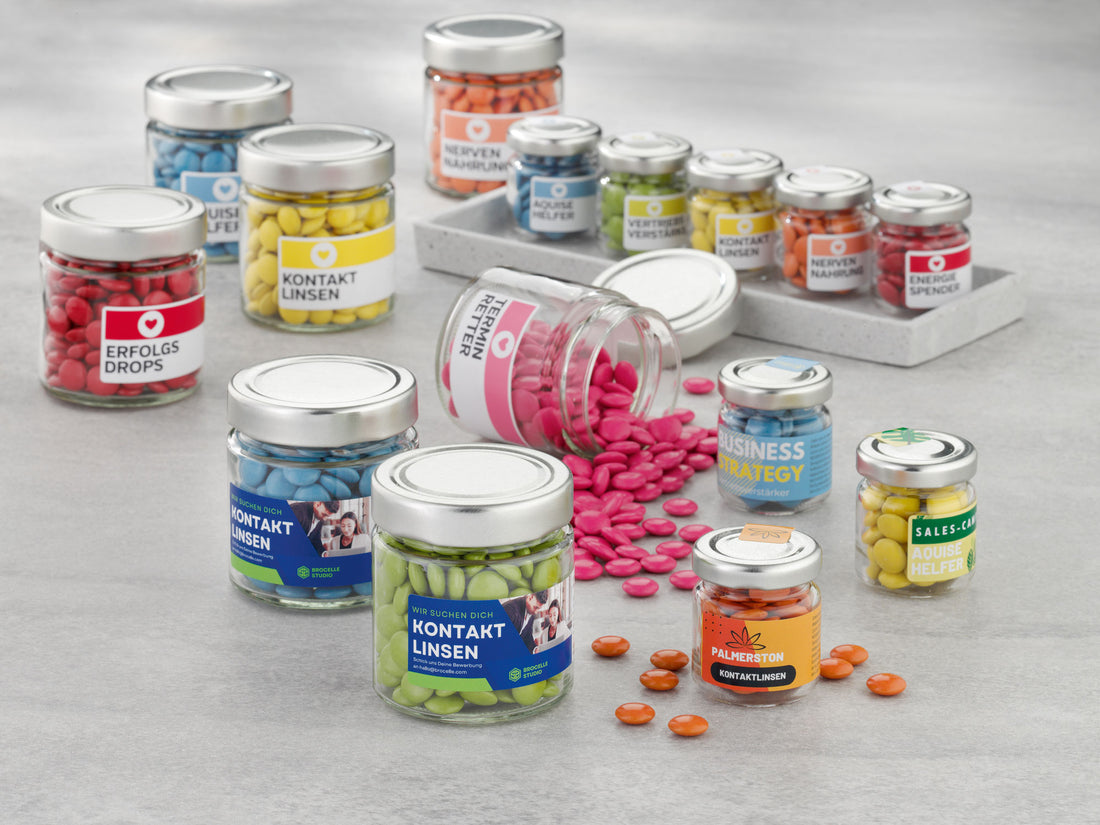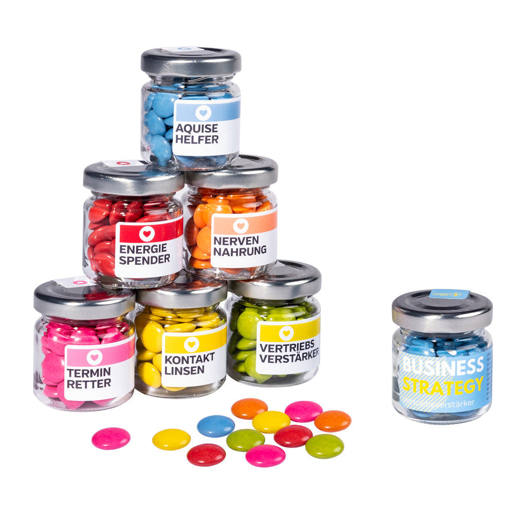 FÜR JEDE STIMMUNG ... Die Drops im einzelnen Glas mit Banderole sorgen als Messe-Give-away oder Streuwerbemittel bei Promotion-Aktionen für hohe Aufmerksamkeit. Mit der sechsfach bestückten „Schokotheke“ sowie den Präsentsets werden ganze Teams oder auch Entscheider genussvoll zum Naschen verführt. Bei diesen exquisiten Premium-Schokodrops in 6 verschiedenen Farbvarianten zeigt der „Erstkontakt“ wirklich Wirkung: Wer sie probiert, ist schon verführt.